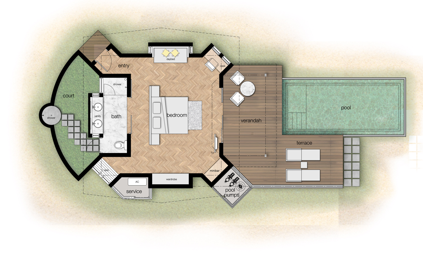 Площадь номера — 120 кв.м. Пляжные виллы с частным бассейном. Состоят из спальни с большой двуспальной кроватью, ванной комнаты полуоткрытого типа с ванной и душем, внутреннего садика с душем под открытым небом, террасы с бассейном, обеденной зоной и шезлонгами. ПЛАН НОМЕРА