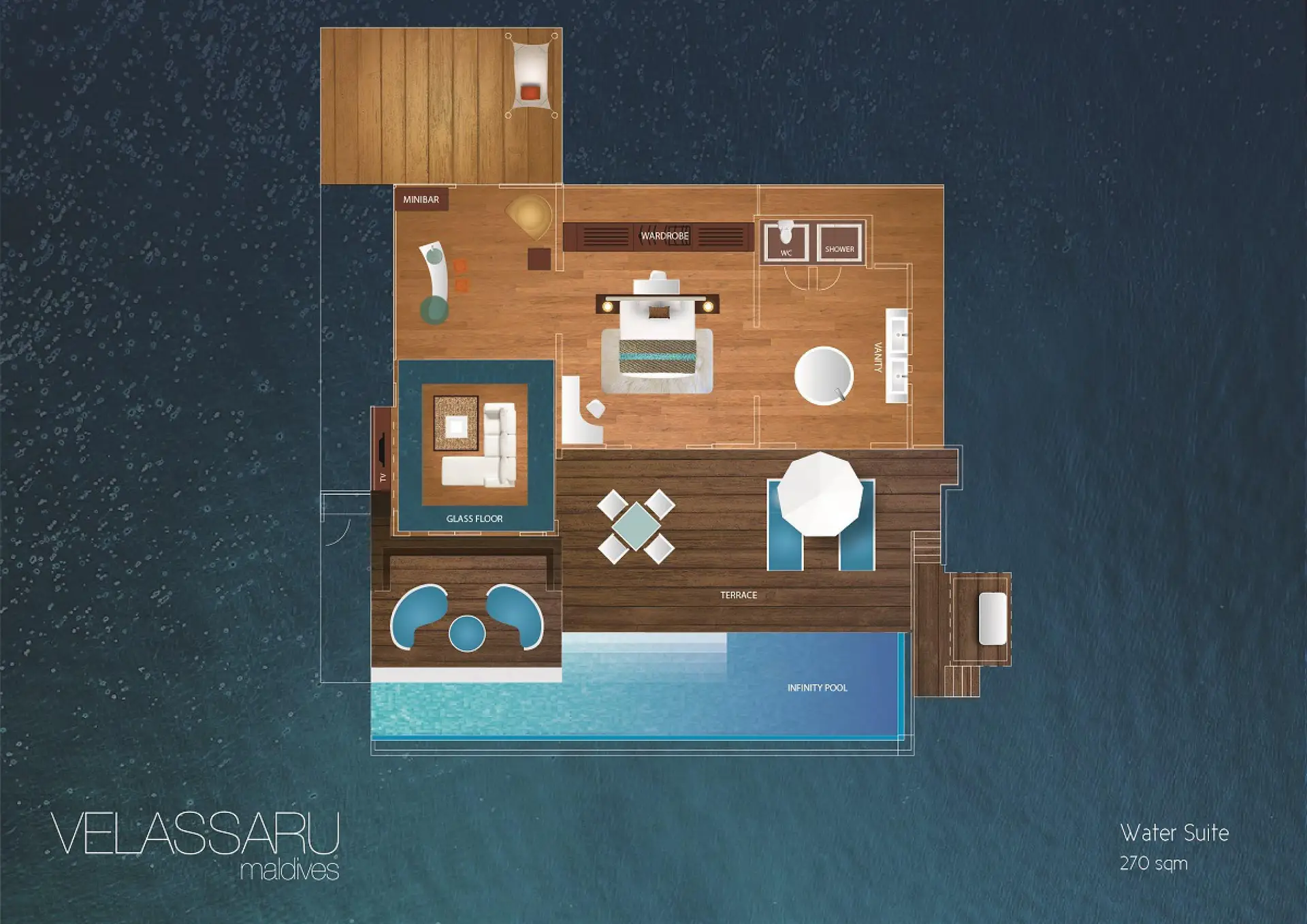 Площадь номера — 270 кв.м. Водная вилла с бассейном. Состоит из спальни с большой двуспальной кроватью; просторной гостиной зоны; ванной комнаты с ванной и душем; большой террасы с обеденной зоной, лежаками, бассейном, душем на открытом воздухе и спуском в лагуну. ПЛАН НОМЕРА