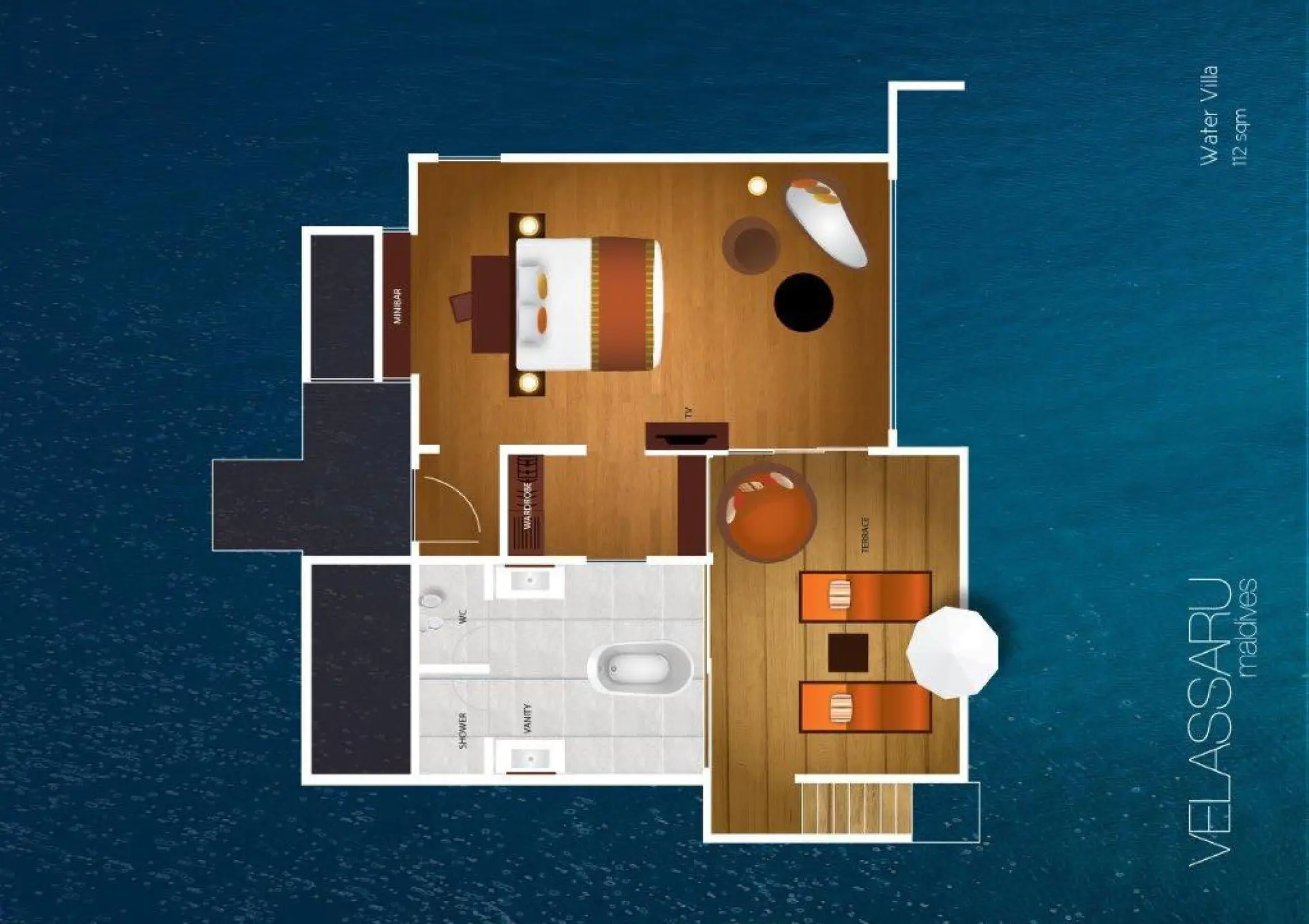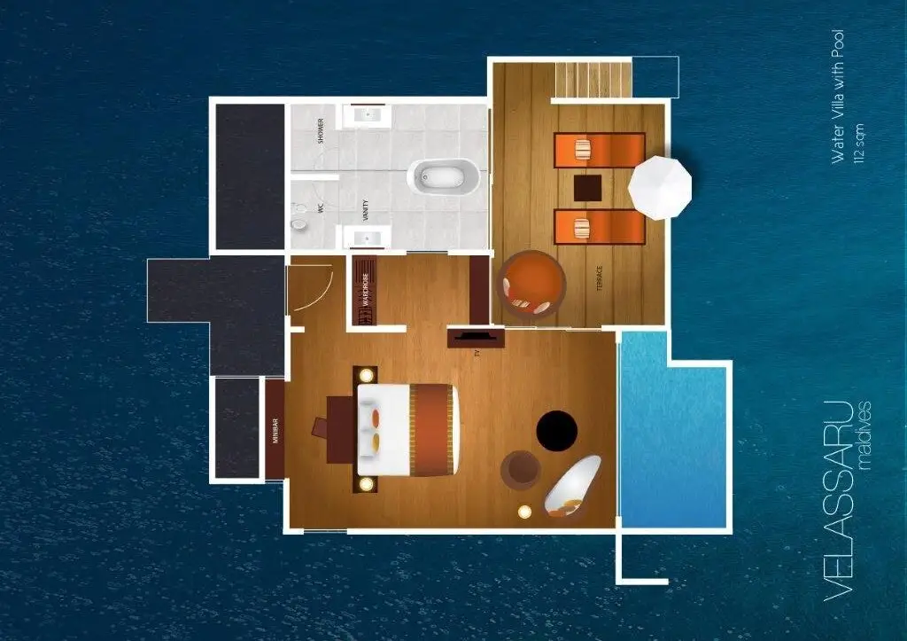 Площадь номера — 112 кв.м. Водная вилла с бассейном. Состоит из спальни с большой двуспальной кроватью и зоны для дневного отдыха; ванной комнаты с ванной и душем; террасы с бассейном, лежаками и спуском в лагуну. ПЛАН НОМЕРА