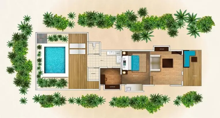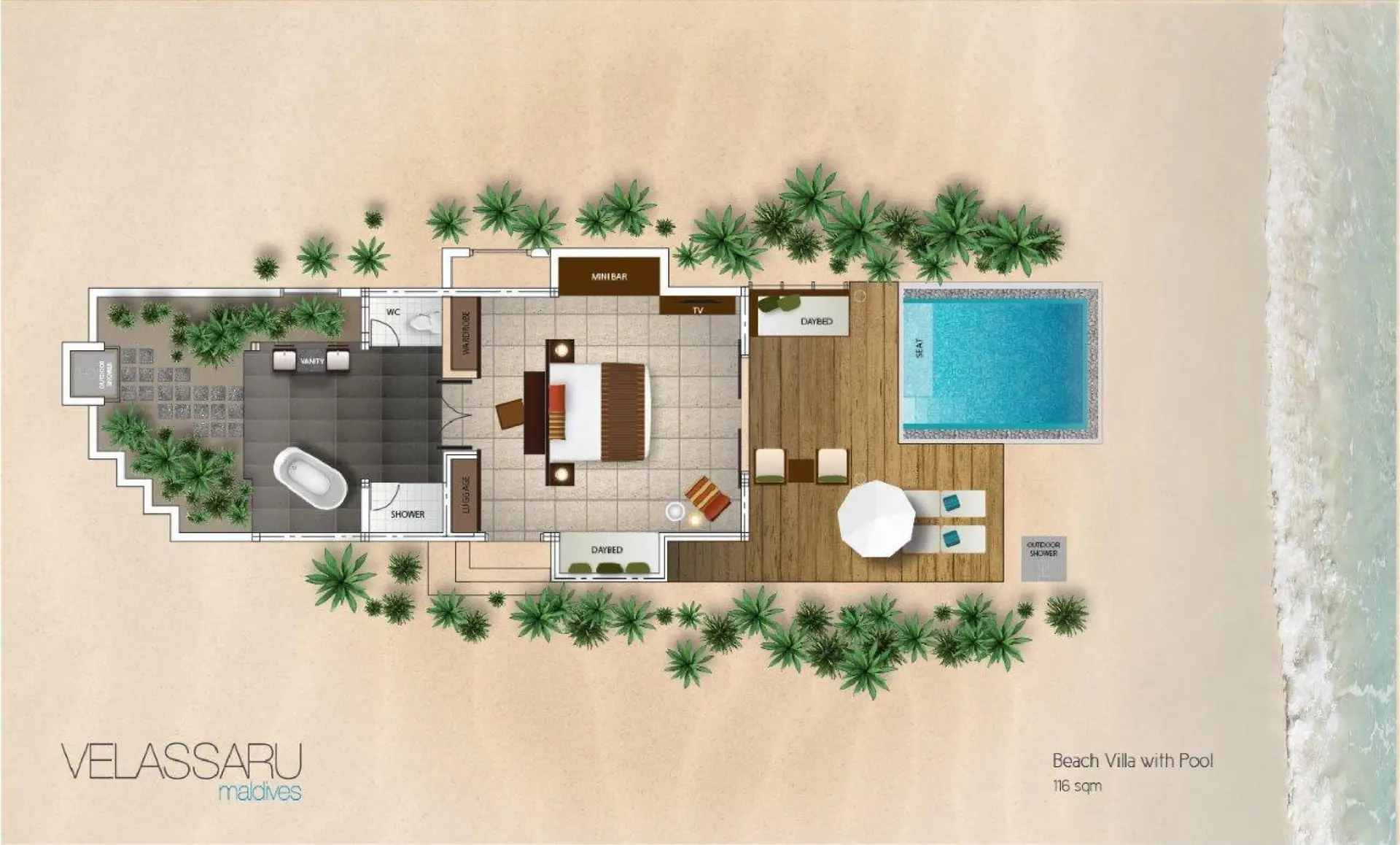 Площадь номера — 116 кв.м. Береговая вилла с бассейном и видом на океан. Состоит из спальни с большой двуспальной кроватью и зоной для дневного отдыха; ванной комнаты в саду с отдельной ванной, крытым и открытым душами; террасы с лежаками, бассейном, душем на открытом воздухе и прямым выходом на пляж. ПЛАН НОМЕРА
