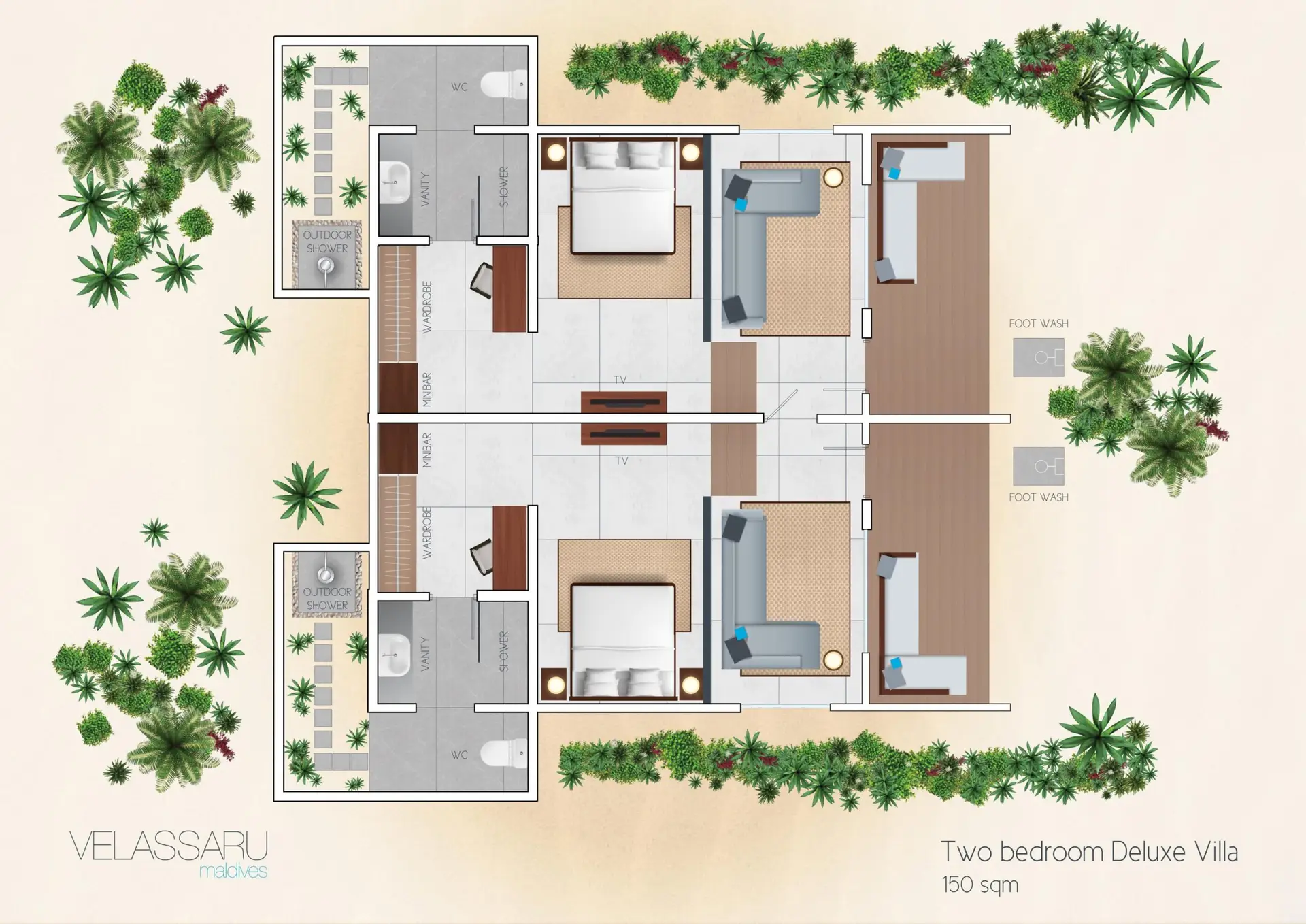 Площадь номера — 150 кв.м. Смежные береговые виллы. Состоят из спальни с большой двуспальной кроватью и зоной отдыха; ванной комнаты в саду с крытым и открытым душами; террасы с лежаками и выходом к пляжу. ПЛАН НОМЕРА